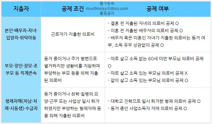 본인을 포함한 배우자, 자녀, 입양자, 위탁아동은 동거의 여부나 소득의 유무에 상관없이 공제대상이며 이혼한 배우자가 이혼 전까지 기본공제 대상자에 해당된다면 이혼 전 배우자의 출산 의료비, 자녀 의료비 등 이 역시 공제 대상이 됩니다.